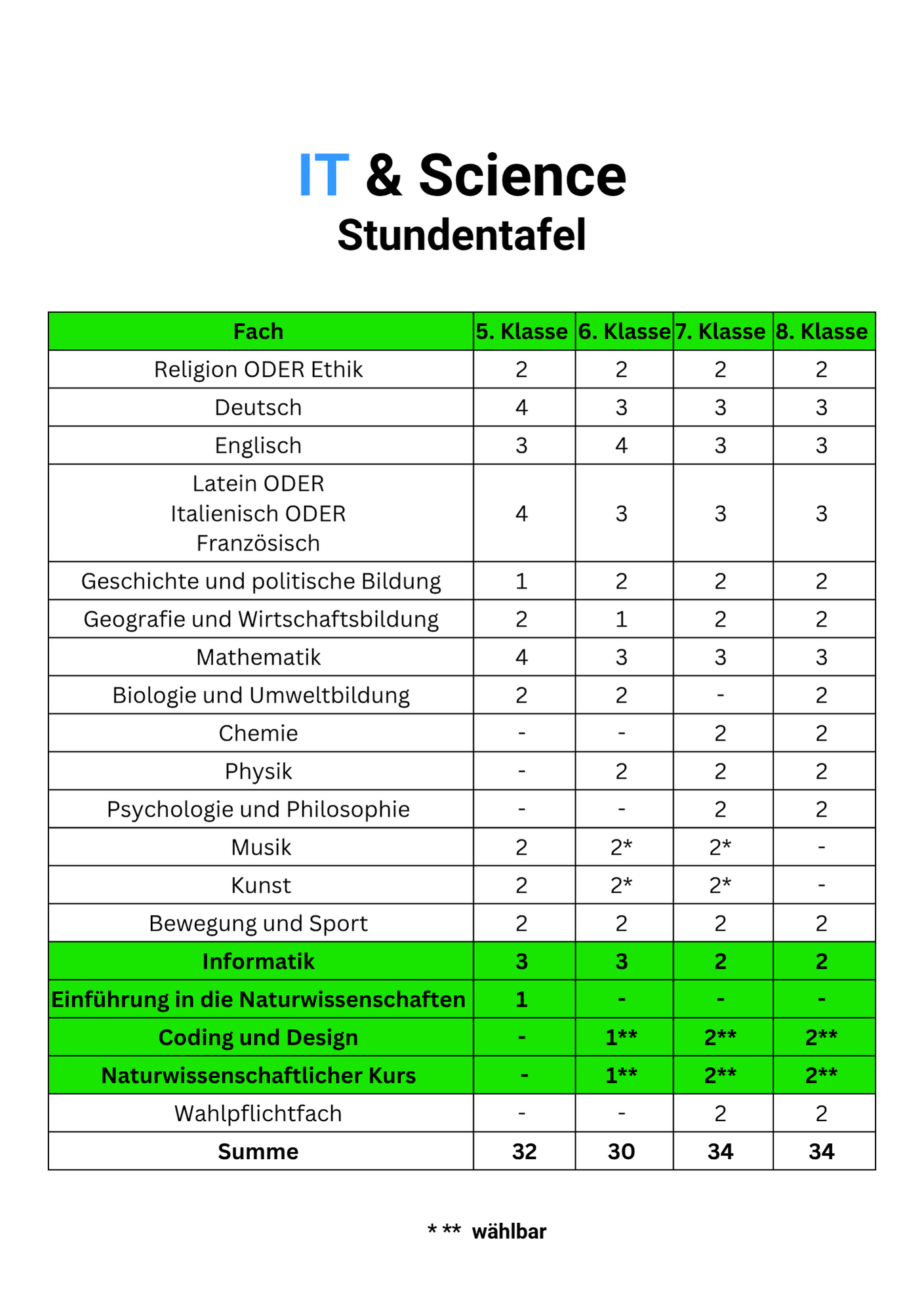 In den jährlich wählbaren Kursen kannst du je nach Interesse ab der 6. Klasse zusätzlich zum Informatikunterricht selbst entscheiden, ob du dich lieber mehr in Informatik ("Coding und Design") oder in Naturwissenschaften vertiefen möchtest.
