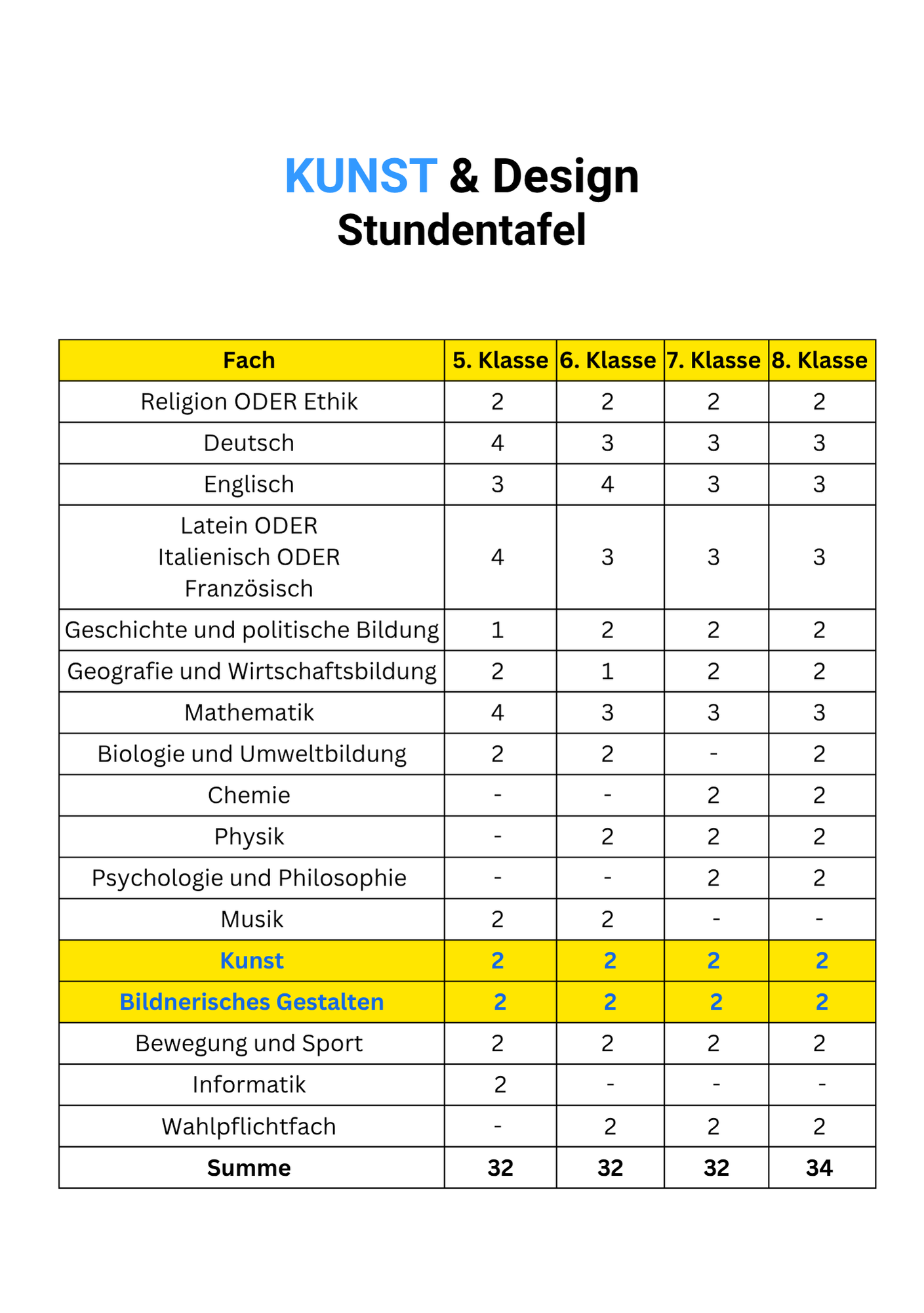 Wir wecken und fördern deine Talente, vermitteln dir ein breites Kunst- und Designwissen und ermöglichen dir den Einblick in zahlreiche Teilgebiete. Das gemeinsame Schaffen und Entdecken steht bei uns an erster Stelle.