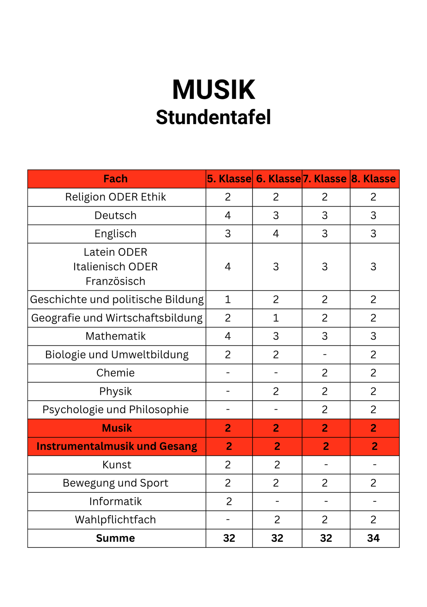 Neben dem Unterrichtsgegenstand Musikerziehung gibt es von der 5. bis zur 8. Klasse Instrumental- und Gesangsunterricht als Pflichtfach.